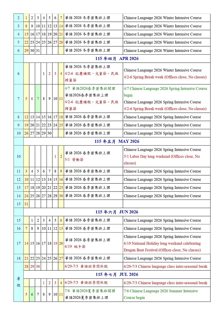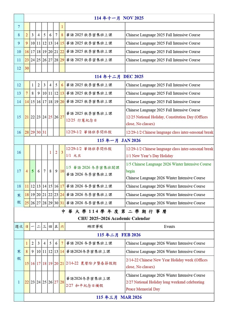 114學年度第一學期行事曆 (CHU 2025~2026 First Semester) - 02